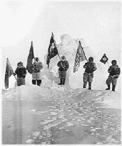 Η κλασσική φωτογραφία της αποστολής του 1909 στον Βόρειο Πόλο, με τους Ινουΐτ να κρατούν σημαίες ποζάροντας στο φακό. |