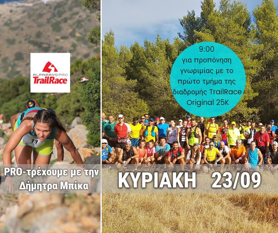Τις δύο τελευταίες Κυριακές του μήνα σας δίνουμε την ευκαιρία να γνωρίσετε σε ρυθμό προσαρμογής και προπόνησης την Original διαδρομή που ακολουθούν οι μεγάλοι αγώνες του ALPAMAYO PRO TrailRace. Την πρώτη Κυριακή 23/09 με την αθλήτρια της La Sportiva και του ALPAMAYO PRO Δήμητρα Μπίκα και τον εμπνευστή της διαδρομής Νίκο Κωστόπουλο θα γνωρίσουμε το πρώτο τμήμα της διαδρομής Original έως το πάνω μέρος του βουνού στην περιοχή ¨Σταυρός¨. Από εκεί ακολουθώντας σύντομο μονοπάτι θα επιστρέψουμε στην αφετηρία ολοκληρώνοντας ένα κύκλο περίπου 15 χιλιομέτρων.