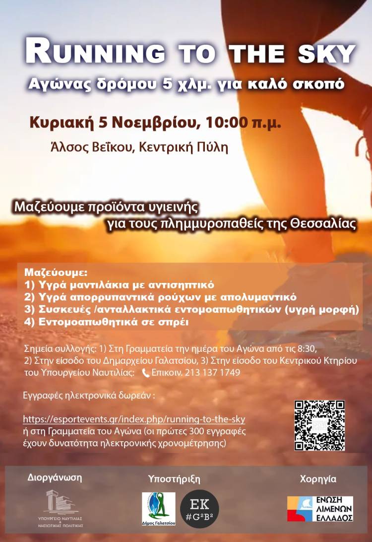 Ο αγώνας θα διεξαχθεί στο Άλσος Βεΐκου (Κεντρική Πύλη) στο Γαλάτσι, την Κυριακή 5 Νοεμβρίου στις 10:00 π.μ., με την επωνυμία «Running to the Sky» και η συμμετοχή σε αυτόν είναι δωρεάν. Αντί αντιτίμου οι συμμετέχοντες καλούνται να προσφέρουν, ότι ποσότητα μπορεί ο καθένας, από τα είδη που χρειάζονται οι πλημμυροπαθείς και όπως αυτά αναφέρονται στην ακόλουθη λίστα: