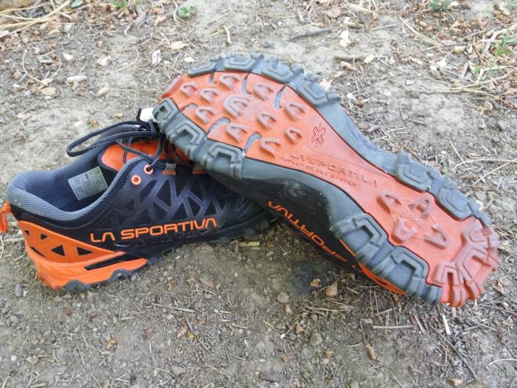 Εξωτερικά το Bushido II στο μπροστινό του μέρος διατρέχεται από λεπτό δικτυωτό ύφασμα πολύ καλής διαπνοής. Όσο πλησιάζουμε προς το κέντρο, βλέπουμε αυτό που η La Sportiva ονομάζει STB Control, όπου λεπτές λωρίδες θερμοπλαστικού φιλμ αγκαλιάζουν το πόδι, με πιο σκληρό πλαστικό TPU να δένει χαμηλά στην ενδιάμεση σόλα ώστε σε συνέργεια με αυτήν να παρέχεται η μέγιστη ευστάθεια καθώς το πόδι αλλάζει συνέχεια κατευθύνσεις σε τεχνικά μονοπάτια. Αξίζει να τονίσουμε ότι το υλικό είναι αντιολισθητικής σχεδίασης και δεν γλιστράει καθόλου.