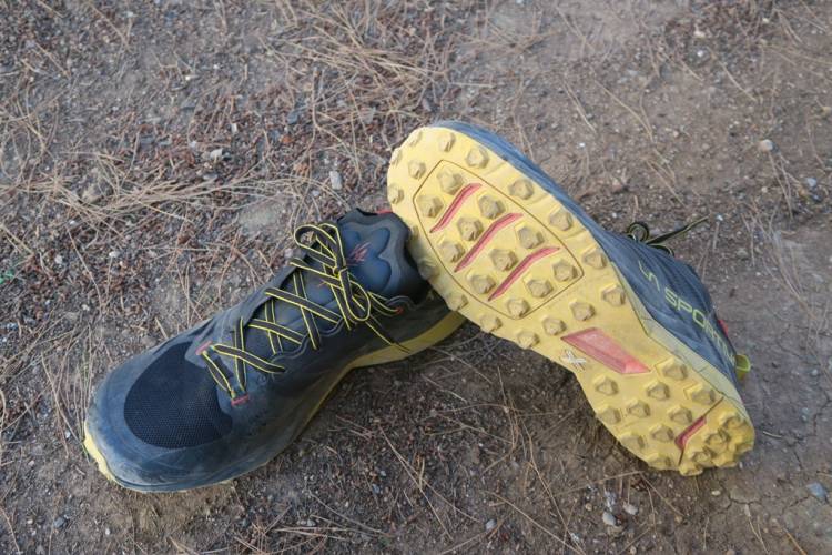 Η ιδιαίτερη σχεδίαση συνεχίζεται και στην σόλα! Κυριαρχούν οι πολυγωνικές τάπες σχετικά υψηλού προφίλ 4-5 mm οι οποίες είναι τοποθετημένες με διαφορετικό προσανατολισμό ανάλογα με το σημείο της πατούσας για καλύτερο φρενάρισμα ή με το εμπρός ή με το πίσω μέρος του ποδιού (Impact Break System). Σαν λάστιχο η La Sportiva έχει επιλέξει το FriXion White, το λάστιχο με το καλύτερο δυνατό grip για παπούτσι τρεξίματος θυσιάζοντας λίγη από την αντοχή της. Το αμέσως καλύτερο grip σε λάστιχο το εφαρμόζει σε αναρριχητικά παπούτσια όπως θα δείτε και στο παρακάτω πινακάκι.
