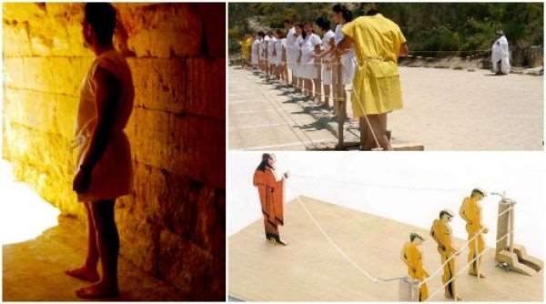 Ο προαύλιος χώρος του ναού ήταν γεμάτος από κόσμο. Στα σκαλοπάτια του, στέκονταν σε χορωδία, με κατάλευκους χιτώνες, οι νύμφες. Από το ιερό ξεπρόβαλε η Ιέρεια Εκεχειρία, με μια ευχή στα χείλη, για κατάπαυση του πυρός από όλες τις πόλεις-κράτη και στην συνέχεια στεφανώνει την Νεμέα, που συμβολίζει η κόρη που είναι μαζί της. Μαζί λαμβάνουν από το ιερό του ναού την ιερή φλόγα, που με πομπή θα μεταφέρουν στο βωμό του σταδίου, όπου θα γινόντουσαν οι αγώνες. Το αρχαιοπρεπές οπλιτικό άγημα «Λεωνίδας» αποθέτει τα όπλα του καθώς περνά η δάδα από μπροστά του. Ο βωμός στο στάδιο δεσπόζει στο τέρμα της