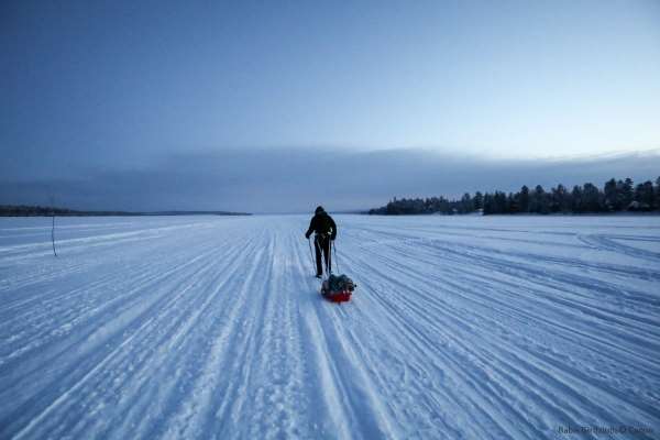 Το σύρσιμο του έλκηθρου το οποίο ήταν δεμένο από την μέση μας προκαλούσε λόγω της έντονης αντίστασης οξύ πόνο στην μέση και στα ισχία. Ήταν ξεκάθαρο πως τον αγώνα δε τον τελειώνουν αθλητές με καλή φυσική κατάσταση αλλά άτομα που μπορούν να αντέξουν μία τέτοια δοκιμασία. Εγώ δεν ανήκα σίγουρα στην πρώτη κατηγορία αλλά ήλπιζα να ανήκω στην δεύτερη. Νιώθαμε να κάναμε βήματα χωρίς πρόοδο. Έσκυβα και κοιτούσα το χιόνι προσπαθώντας να διαχειριστώ την στασιμότητά μας. ”Ένα βήμα την φορά. Και μετά ακόμη ένα. Πρέπει να βάζω το ένα πόδι μπροστά από το άλλο. Τίποτα παραπάνω , τίποτα λιγότερο” , ψιθύριζα στον εαυτό μου συχνά. Η ώρα ήταν περίπου 17:00. Τον θολό ήλιο της περιοχής τον διαδέχθηκε το αρκτικό σκοτάδι. Ένα σκοτάδι που κρύβει μέσα του ομορφιά και κινδύνους, πίστη και αμφιβολίες.Η θερμοκρασία έπεσε απότομα και συχνά ένιωθες μουδιασμένα τα χείλη και τα μούσια να έχουν κρυσταλλοποιηθεί. Ένιωθες το βαθύ σκοτάδι να σε καταπίνει και να σε αποπροσανατολίζει. Ονειροβατούσες πάνω σε ένα λευκό αχανές τοπίο χωρίς την αίσθηση του χώρου. Και το μόνο που σου έδειχνε πως όλο αυτό δεν είναι αποκύημα της φαντασίας σου ήταν η ταλαιπωρία που ένιωθες σε κάθε κύτταρο του σώματός σου καθώς σου φανέρωνε την ανθρώπινη αδυναμία μας. Ανοίξαμε τους φακούς μας και από μακριά φαινόμασταν σαν αδύναμες και αργοκίνητες πυγολαμπίδες. Το μόνο που άκουγες ήταν ο ήχος από τα βήματα που πατούσαν στο φρέσκο χιόνι. Την μονοτονία αυτή την έσπαγε καμιά φορά κάποιος αναστεναγμός απόρροιας της κούρασης. Φτάνοντας στην περιοχή του Kuasilampi, περίπου στις 12 το βράδυ τα πρώτα σημάδια υπνηλίας είχαν κάνει την εμφάνιση τους. Υπενθύμιζα συχνά στον εαυτό μου πως έχω βρεθεί σε παρόμοιες καταστάσεις και πως όπως όλα κάποτε τελειώνουν. Αρκεί να υπομείνεις. Ήξερα πως η υπνηλία κάποια στιγμή θα φύγει αλλά δεν ήξερα το πότε. Σκεφτόμουν πως είχα μπροστά μου ακόμη 24 ώρες αγώνα χωρίς κάποια ξεκούραση και πως ήταν ακόμη πολύ νωρίς για παράπονα. Σε μία κατάσταση μέθης κάθε βήμα φάνταζε νίκη.