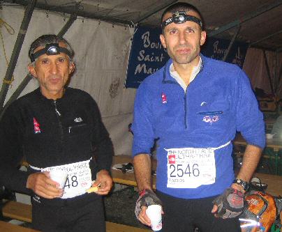 Κατηφορίζουμε για το Chapieux και αρχίζουν κάποιοι να μας προσπερνούν. Δεν είναι η κατηφόρα το καλύτερό μου. Κάθε τόσο κιόλας πρέπει να σταματώ να βγάζω μικρά πετραδάκια από τα παπούτσια μου, που τα ίδια ευθύνονται γι αυτό, εξαιτίας του grip της σόλας. Έπρεπε να είχα φορέσει γκέτες, όπως έκαναν αρκετοί άλλοι αθλητές που παρατήρησα νωρίτερα. Με μικρές απώλειες φτάσαμε στο σταθμό του χωριού στο ΚΜ-44 σε λιγότερο από 7 ώρες και κάτω από την 200η θέση. Έτσι είπαμε να το γιορτάσουμε, τρώγοντας βασιλικό γεύμα και παρατηρώντας ως θεατές δεκάδες άλλους να μας προσπερνούν ενώ εμείς απολαμβάναμε ζεστή σούπα, νερά και αναψυκτικά στα τραπέζια του σταθμού. «Δε βαριέσαι, ο αγώνας είναι πολύ μεγάλος, ας είμαστε επιφυλακτικοί κι ας τρώμε συχνά» προτείνω. Ο μπουφές εκπληκτικός, δε σ αφήνει να φύγεις. Πάμε κι ερχόμαστε απ τον πάγκο στο τραπέζι σαν να βρισκόμαστε σε φοιτητική εστία. Τα πόδια μου αρχίζουν να έχουν συμπτώματα κόπωσης, με πόνο στους τετρακέφαλους. Ο Δημήτρης αδειάζει ένα φακελάκι άσπρη σκόνη στο ποτήρι του και το πίνει. Είναι ώρα για τα μαγνήσια μας, για να γλυτώσουμε τις κράμπες στη συνέχεια. Βγάζω τα ‘μυστικά’ χαρτονάκια μου με τον προγραμματισμό: «Πάμε καλά σε γενικές γραμμές, είμαστε μέσα στα όρια για τις 30 ώρες». Τι άλλο θέλουμε!!