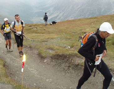 Ανεβαίνουμε στο φεγγαρόφωτο τη δεύτερη μεγάλη ανάβαση της νύχτας, προς τα Ιταλικά σύνορα: Col Seigne (2516). Αυτή η αγχωτική φωτεινή ουρά πίσω μας δε λέει να χαθεί. Εκεί που λες «τώρα έμεινα μόνος» κάποιος εμφανίζεται σε δευτερόλεπτα από πίσω και σε προσπερνά. Ευτυχώς τα φωτάκια που βρίσκονται μπροστά μας μας δείχνουν πού τελειώνει η ανάβαση. Bella Italia! Κατηφόρα για καταφύγιο Elisabetta. Επιτέλους, φτάνουμε στο σταθμό (ΚΜ-58), μια τέντα στο πουθενά φωτισμένη με προβολείς. Τσάι, αναψυκτικά κι όλα τα καλούδια, απλωμένα για χάρη μας. Με πλησιάζει ο αθλητής με τον αριθμό 1896. «Γεια, πώς πάτε?» Τον είχα συναντήσει στο 5ο χιλιόμετρο μόλις –προσπερνούσε κι αυτός σαν εμάς τότε- και είχαμε ανοίξει κουβέντα. Από τότε τον συναντήσαμε άλλες 4-5 φορές, φοβερό! Γάλλος που τρέχει βουνό και ήταν για πρώτη φορά στον αγώνα. Συμπτωματικά πήγαινε κι αυτός για 30 ώρες, όπως κι εμείς. «Καλά πάμε» σκέφτηκα «αφού κι ο 1896 έχει τα ίδια περάσματα με μας είμαστε εντάξει». Συνεχίζουμε τον κατήφορο στη φεγγαράδα. Τα φωτάκια που μας καταδιώκουν αρχίζουν να απλώνονται πια και κάποια ιταλικά τσοπανόσκυλα κάνουν υπερωρίες, γαυγίζοντας μάταια μέσα στο σκοτάδι όλους εμάς.