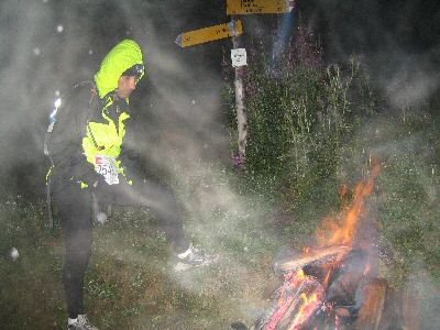 Καρφί ανήφορος για το καταφύγιο Les Tseppes (KM-135). Εξαιρετικό μονοπάτι και λίγη βροχή να μας θυμίζει ότι δεν πρέπει να ξεθαρρεύουμε. Πιο πάνω ομίχλη και στο σταθμό γελαστοί εθελοντές με μπύρες και φωτιές για ζεστασιά. Τριγύρω είχε καθίσει η ομίχλη. Εμείς φρέσκοι και ευδιάθετοι τραβήξαμε μπροστά με διάθεση. Ομίχλη και μόνο ομίχλη (μαζί με λίγη βροχή), ορατότητα μηδέν. Φακός κεφαλής, το πιο χρήσιμο εργαλείο στον αγώνα. Χωρίς φακό είσαι τελειωμένος, δεν πας πουθενά. Δυο μεγάλες φωτιές καίνε κοντά στο σταθμό και μας προσφέρουν τη ζέστη τους, είναι καλοδεχούμενη. Στη συνέχεια μπαίνουμε σε μια ατέλειωτη ευθεία σε γυμνό τεραίν με την ομίχλη να με κάνει να μπερδεύομαι κάθε τόσο. Ευτυχώς εκείνα τα φωσφορούχα σήματα της διοργάνωσης (τα balisages) μας σώζουν κάθε τόσο που τα βρίσκουμε μπροστά μας.