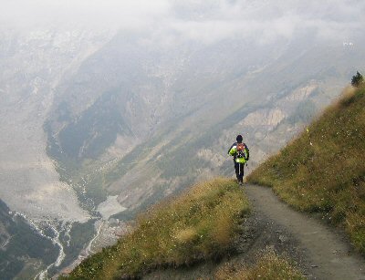 Πιάνω το Δημήτρη που είχε αποσπαστεί και στο τέλος της ανηφόρας τραβερσάραμε πλατσουρίζοντας στα νερά της βροχής που συγκρατούσε το μονοπάτι-χαντάκι στην αλπική ζώνη. Ξαφνικά μια φωταύγεια που χτυπούσε πίσω από την κορυφογραμμή άνοιξε μπροστά μας μια μαγική φωτεινή σκηνή: κάτω χαμηλά –αλλά όχι μακριά- χιλιάδες φώτα μέσα στη σιωπή παραταγμένα, σαν σκηνικό ταινίας επιστημονικής φαντασίας. Αποικία των Αρειανών, η χαμένη Ατλαντίδα, το Chamonix? Τι ήταν αυτό που σε τραβούσε να κάνεις μια σιωπηλή νυχτερινή πτήση από πάνω του? Ανοησίες, η νύστα μου μ έκανε να βλέπω μαγικές εικόνες… Κι όμως ήταν εκεί και φώτιζε. Προφτάσαμε δυο κοπέλες με σακίδια στην πλάτη –ήταν στον αγώνα? κανένας δεν ξέρει πια- τις ρωτήσαμε και μας είπαν ότι πρόκειται για το Martigny, τη μεγάλη πόλη της περιοχής. Άρα δεν ήταν το Chamonix –μα τι βλακεία, πώς θα είναι το Chamonix αφού μας μένουν ακόμα 30 χιλιόμετρα.