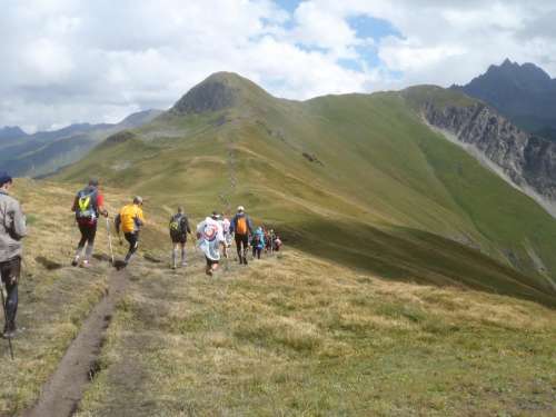 Tete la Tronche (17o χλμ) οι κλίσεις ήταν διαφορετικών δυσκολιών και ο καιρός έδειχνε σημάδια ανάκαμψης αφού έβγαλε μέχρι και ήλιο σε κάποιες φάσεις. Η λάσπη είχε λιγοστέψει και νομίζαμε ότι τα χειρότερα πέρασαν. Πανέμορφα αλπικά λιβάδια και πανέμορφη η θέα του Mont-Blanc (όσο φαινόταν...) απέναντι. Μετά από εκεί για λίγο είχε απότομη και επικίνδυνη κατηφορική κλίση (κάποιοι τολμηροί την πάτησαν και μέτρησαν πετρούλες) αλλά μετά οι κλίσεις εξομαλύνονταν και ήρθε η ώρα για λίγο απολαυστικό τρέξιμο σε ωραίο και εύκολο τεραίν. Ο καιρός άνοιγε, ανοίγαν και οι καρδιές μας και ζεσταθήκαμε λίγο. Το τοπίο εξακολουθούσε να είναι φανταστικό. Στο
